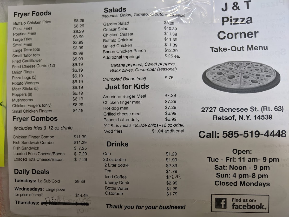 Welcome to J&T's Pizza Corner, your new go-to for delicious, fresh pizza in Piffard, NY! Located at 2727 Genesee St, this charming eatery prides itself on quality ingredients and exceptional customer service. From classic cheese and pepperoni to specialty options like buffalo chicken and meat lovers, their sheet pizzas have garnered rave reviews, making them a hit for celebrations like birthday parties.